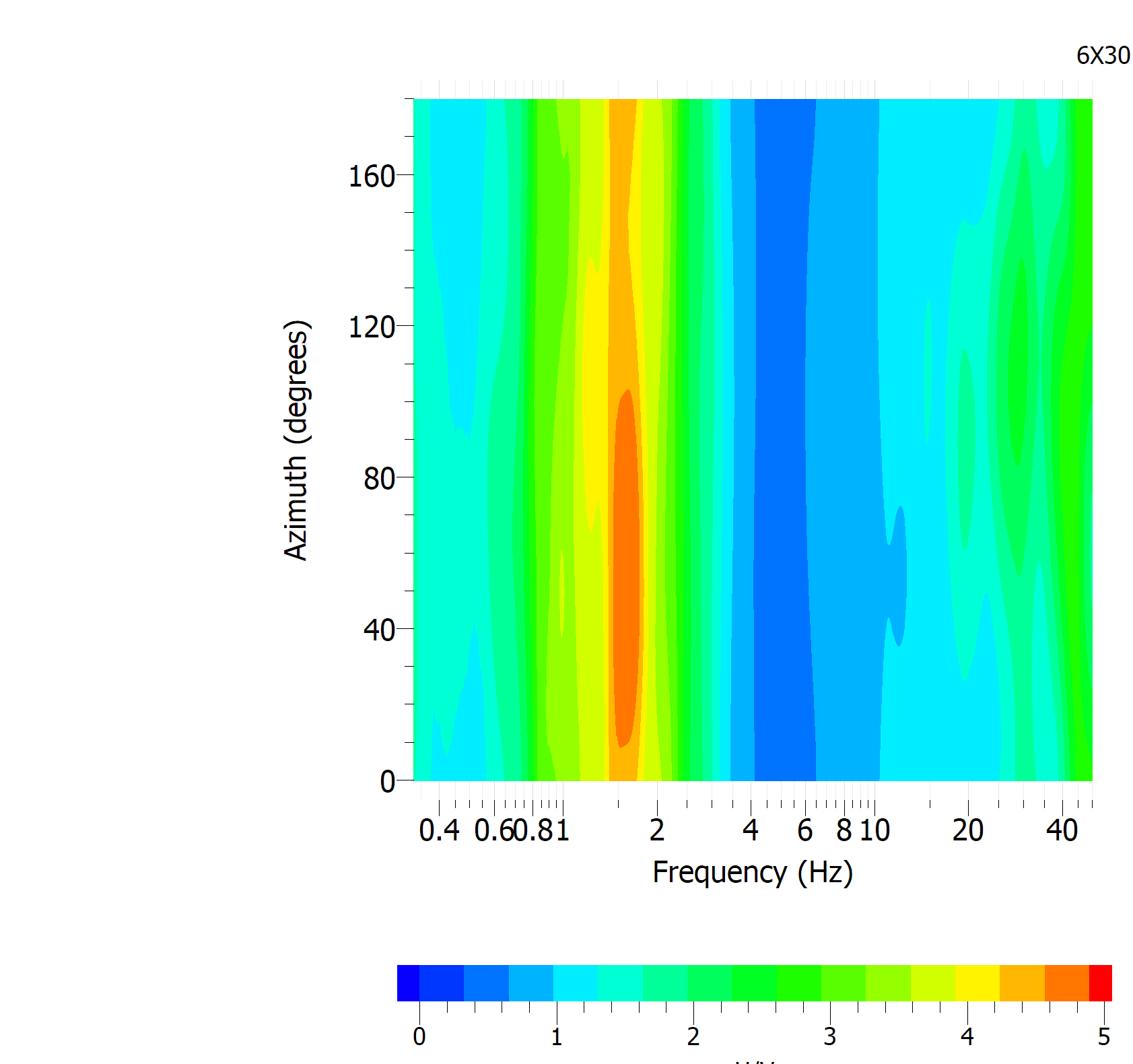 To calculate the H/V ratio signals are first recorded at single stations on site, using a three-component seismometer, comprising two horizonal sensors (North-South and East-West) and one vertical sensor (up-down). The signals from each of the three sensors are initially processed in parallel by splitting each component into matching time windows, usually of thirty seconds or one minute. This allows windows with unusable signals to be removed. The recorded signals in each window are split into their component frequencies using a Fourier transform algorithm. The results are smoothed using the method by Konno & Ohmachi (1998). The two horizontal components are averaged and then divided by the vertical. The resulting H/V ratios are plotted on frequency spectra for each time window. The mean of all the H/V ratios is made to provide a single averaged spectra line, along with lines indicating one standard deviation above and below the mean, as can be seen in Figure 1(a). The energy in the horizontal components also can be processed to evaluate energy propagation in a specific azimuth, and multiple azimuths can be combined to provide a view of how the peak frequency varies rotationally. A heat map of an azimuthal analysis is provided in Figure 1(b).