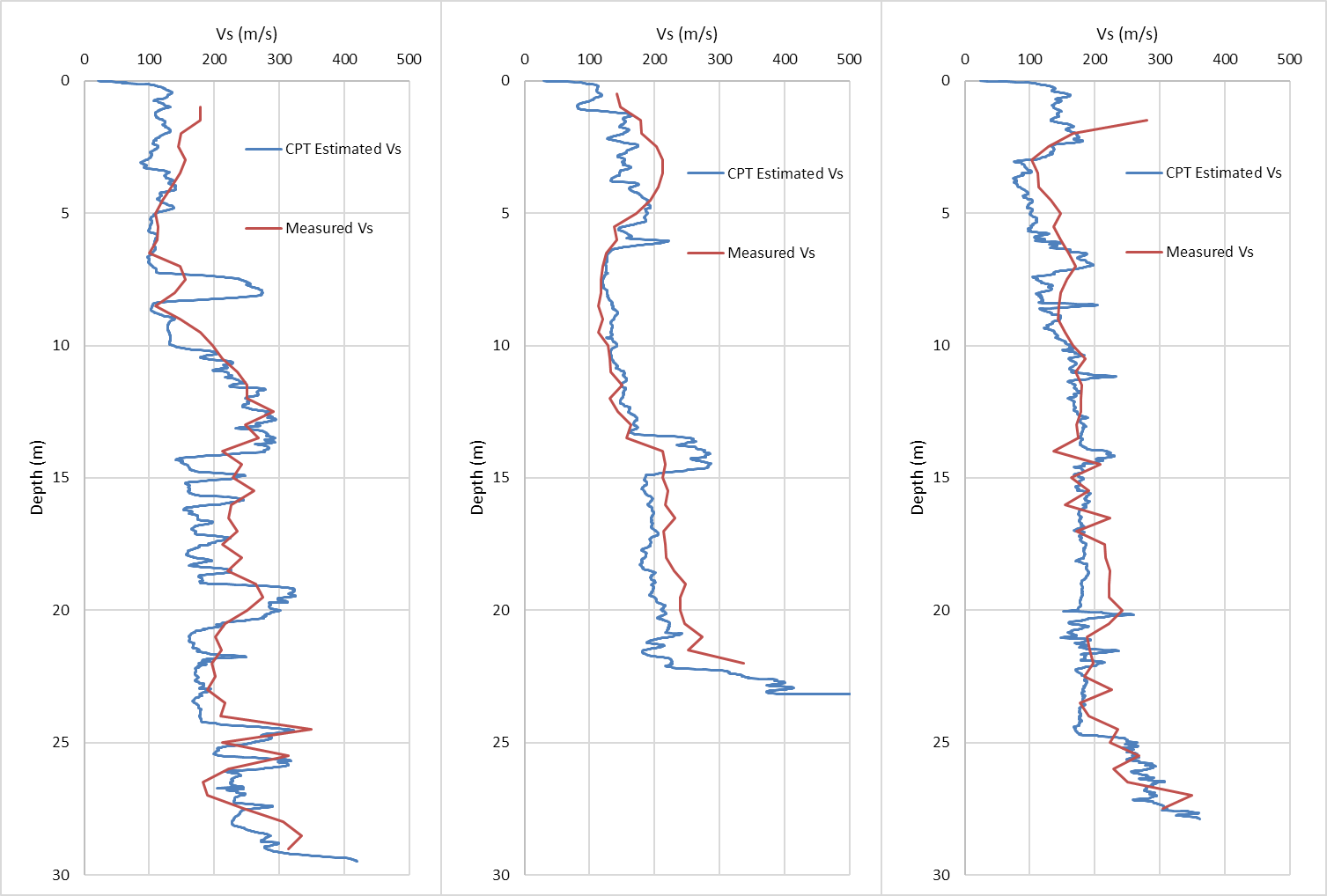 The empirical correlation for Vs from CPT used in this paper (Robertson 2009) appears to provide a reasonable estimate of Vs in the Puketoka Formation soils. However, this should not be relied on alone. Correlations of Vs from CPT data should only be relied upon if they can be validated on a site-specific basis or have been verified from research in the geological unit in question and shown to be reliable.