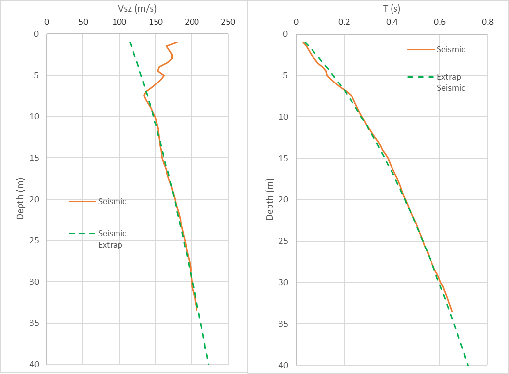 The extrapolation of the curves is reasonable provided that a distinct trend can be seen in the curves and that the data is not extrapolated too far, say, no further than 25% beyond the bottom depth of the SCPT. If the SCPT has reached a significant depth and there is an obvious trend, then the average shear wave velocity, Vsz, is likely to continue to follow that same trend as changes in Vs below that depth will have little effect on the overall average; at least over a small additional depth and provided the shear wave velocity doesn’t change dramatically.