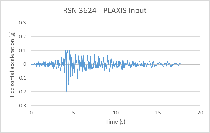 To optimise analysis time, and since the selected earthquake records have tail ends with circa null acceleration, these have been shortened to optimise analysis time. Each of the scaled earthquake records has been introduced at the base of the FE models and allowed to freely amplify within it, with horizontal accelerations at both surface and rockhead levels monitored throughout the time history analysis.