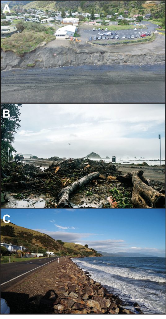 Photo: Different coastal adaptation approaches will be required in different local contexts: Photo A) shows Port Waikato in 2015, before the community building was completely removed (Credit: T. Shand); Photo B) shows storm surge impacts on Wellington’s south coast in June 2013 (Credit: D. Allen, NIWA). Photo C) shows a low-lying exposed road on the Thames coastline (Credit: T. Shand).