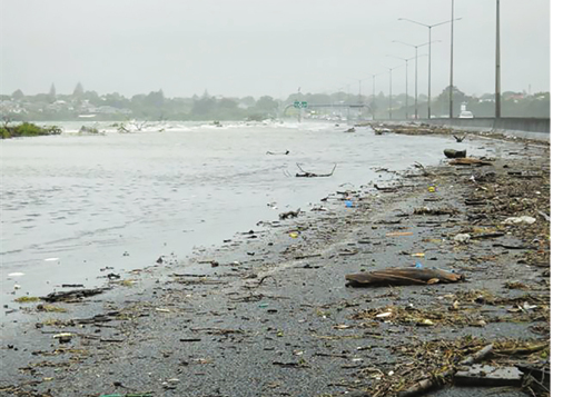 Photo: Waterview Causeway, North-western motorway in Auckland on 23 January 2011 during a storm high tide. Photo credit: Auckland Motorway Alliance.