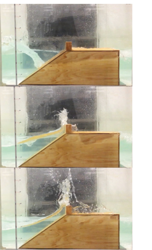 Figure: A 1:10 scale model of Tamaki Drive being tested under conditions replicating ex-tropical cyclone Ita, which occurred in 2014, with severe overtopping occurring, as was observed on site.