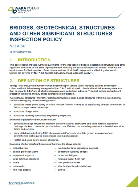 The latest version of S6 policy was published in February 2020 and introduces geotechnical structures for the first time, to get a copy, google ‘NZTA S6’.