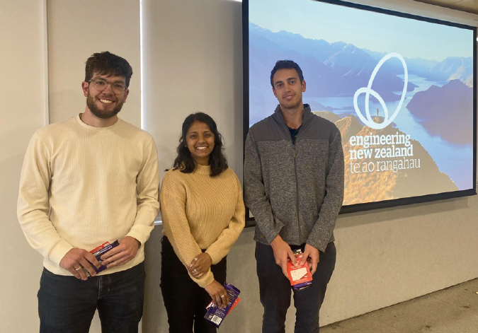 Figure 2: First and second-place prize winners Meenakshi Patel (ENGEO), centre and Charles Chin (LDE), right and the people’s choice prize winner, Theo Culkin (WSP), left.