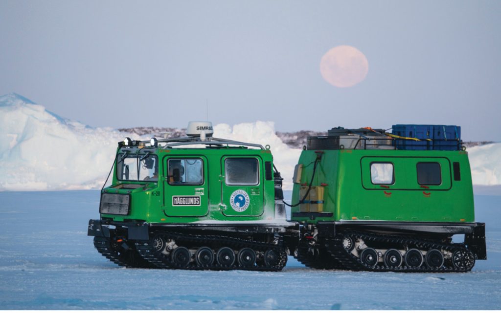 Progress along the site alignment carried on throughout the rest of the winter, interspersed with frequent blizzards which required clearing snow from the station and access roads before the drill rig itself could be reached to be dug/melted out of the snow. The use of tracked vehicles, Hagglunds, to access site sped this process up a bit, however between the weather and the challenges of drilling and moving the rig around the site throughout winter, progress was still limited to 1-2 boreholes a week.